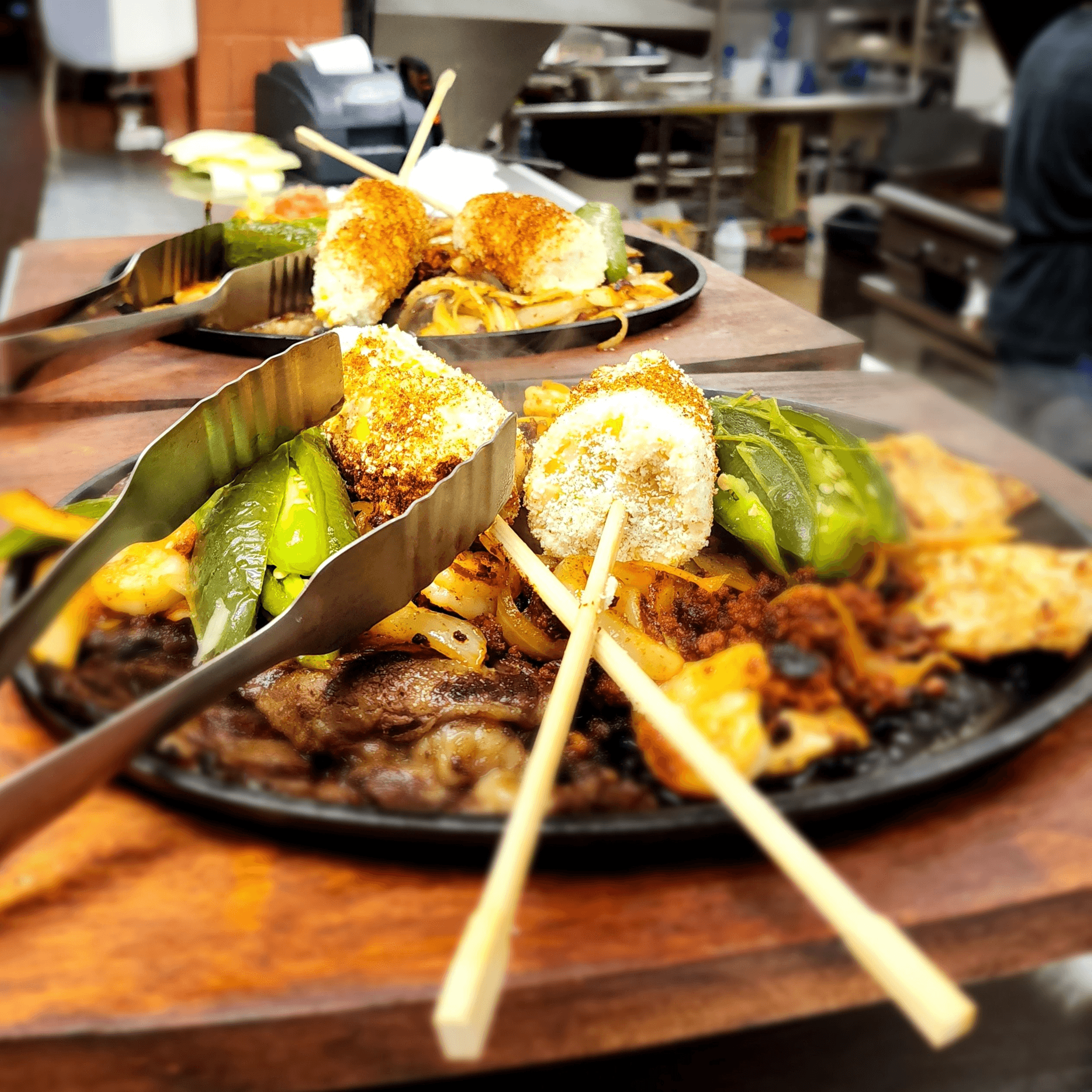 Bed of tortilla chips topped with meat, bell peppers, onions and cheese