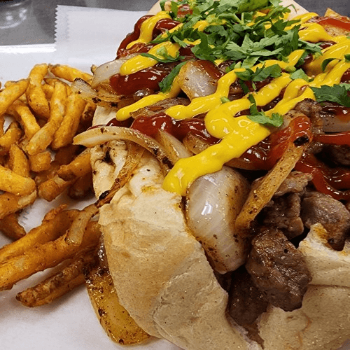Hot dog wrapped in crispy bacon and topped with your choice of meat, grilled onions, cilantro and mayo on a hoagie roll, served with fries.