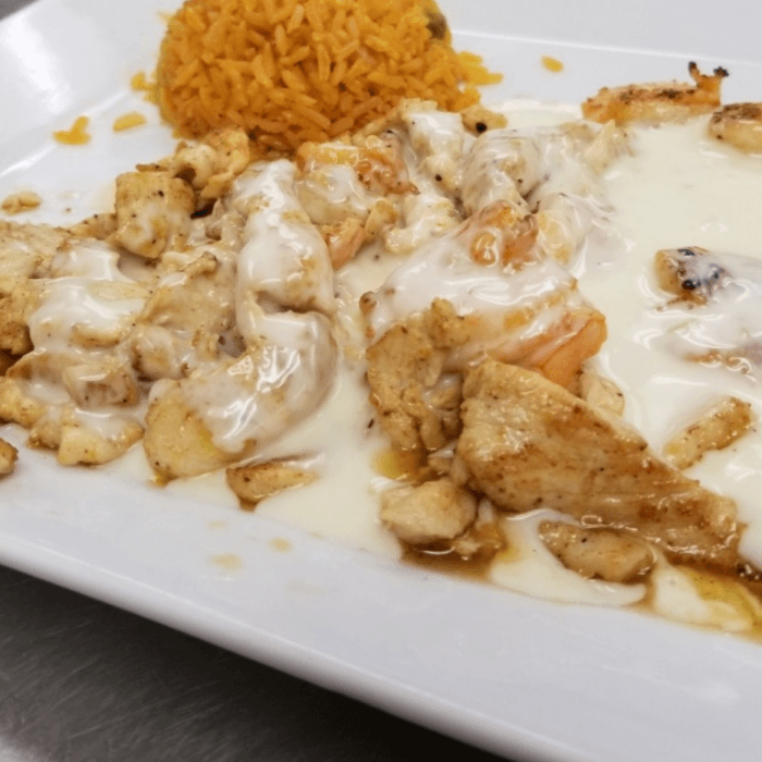 Grilled chicken and shrimp served with Mexican rice and topped with cheese sauce